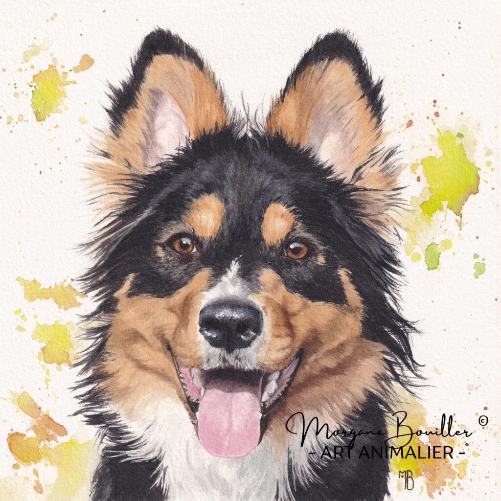 Un portrait animalier réaliste, sur mesure de votre chien, chat ou cheval, peint à la main à l’aquarelle.